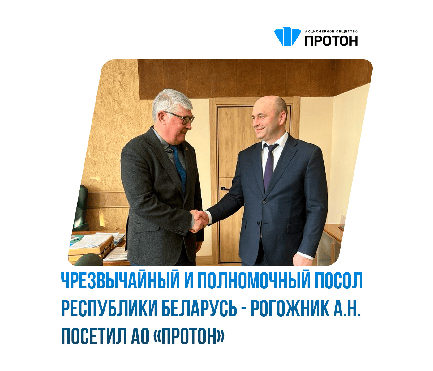 Для АО «Протон» укрепление сотрудничества с братской Республикой Беларусь имеет стратегическое значение. В ходе встречи генеральный директор предприятия Вячеслав Валентинович Меньшов и Александр Николаевич Рогожник обсудили перспективы совместной работы и расширения партнерских отношений.
