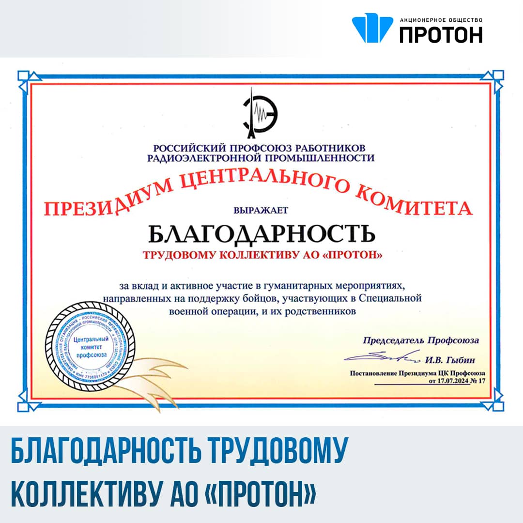 Трудовой коллектив АО «Протон» отмечен благодарностью!